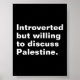 Este é um "Introduvertido mas disposto a discutir a Palestina" especial dizendo design para palestinos, palestinos amam pró-palestinos, ou, todos que apóiam liberdade e justiça e lutam contra a injustiça. A todos os partidários da justa causa palestiniana. Levante e apoie a libertação da Palestina e de Gaza e o estabelecimento da paz em Jerusalém. Projetado pelos designers do Peace Lover. Parem com o conflito entre Palestina e Israel. As vidas palestinas importam. (VOCÊ PODE MUDAR E PERSONALIZAR ESTE DESIGN DE TEXTO!).