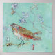 Aqua Bird, por Kellie Day. Pequeno passarinho criado com texturas variadas para adicionar profundidade. Fundo é um belo talhe com flores azuis pequenas.| SID21474