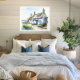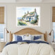 Poster com a ilustração aquosa de uma charmosa zona costeira de Cornwall à beira-mar. A ilustração revela uma cabana branca de reboco com um telhado talhado, uma porta/entrada azul de fazenda e janelas azuis à beira-mar. A cascata é colocada sobre as massas de calcário que se sobrepõem ao litoral da Cornualha, com vegetação e flores azuis e perenes salpicados por toda a paisagem e céus azuis e gaivotas a balançar. A ilustração foi projetada para um poster 20 x 16. Tamanhos adicionais e opções de quadro disponíveis. A ilustração pode ter de ser ajustada para diferentes tamanhos.
