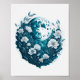 Cartaz místico e celestial em aquarela com uma lua e flores brancas com estrelas em tons azuis. Decoração ideal para casa em quarto de menina, berçário, sala de artesanato,... Moldura dourada não incluída.