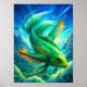Na imagem, um peixe verde vibrante natação graciosamente através de um céu azul brilhante, desafiando as leis da natureza. As escamas dos peixes brilham à luz do sol, refletindo os tons de esmeralda e limão. Suas barbatanas estão espalhadas, criando um senso de movimento e elegância enquanto ela flutua pelo ar. As nuvens brancas se movem ao fundo, melhorando a atmosfera surreal da cena. A combinação do peixe com o céu cria uma imagem caprichosa e encantadora, convidando os espectadores a imaginar um mundo onde tudo seja possível.