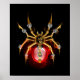 Aranha mecânica, com pá-pá de ouro, engrenagens de latão e uma lâmpada de vidro vermelha sobre fundo preto. Estilo Steampunk.