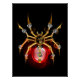 Aranha mecânica, com pá-pá de ouro, engrenagens de latão e uma lâmpada de vidro vermelha sobre fundo preto. Estilo Steampunk.