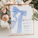 Bem-vindos convidados em estilo com este charmoso sinal de boas-vindas ao chá de fraldas azul! Apresentando uma delicada ilustração da fita de satin, tons pastéis macios e tipografia elegante, este sinal define o tom perfeito para uma celebração sofisticada e animadora. Personalize-o com o nome da futura mãe e os detalhes do evento para um toque único.