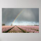 Poster de um arco-íris e nuvens escuras durante uma tempestade de primavera sobre uma paisagem com um moinho de vento velho e flores cor-de-rosa na região holandesa do Bulbo. decoração de excelente na sua parede!