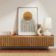 Uma abstrato mínima com um design geométrico de meio século na mostarda e preto num fundo branco desligado. Um acessório perfeito para uma casa contemporânea.