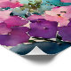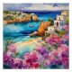 "Arcos Pelo Mar". Uma vista idílica de uma bela baía, com um barco solteiro. Uma pequena praia arenosa é enquadrada por um belo mar de azure e flores rosa e roxas.
