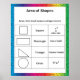 Poster de matemática divertida que tem a área de fórmulas para quadrados, círculos, retângulos e triângulos contra fundo arco-íris