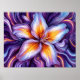 Uma flor lírio, feita em estilo abstrato, vibrante. As pétalas exibem uma mistura de cores, incluindo púrpura macia, brancos e laranjas vivas, criando uma interação dinâmica entre luz e textura. Essas cores fluem perfeitamente para o fundo, que é repleto de tons roxos e pontas de azul, melhorando a sensação de movimento e profundidade. O efeito geral é visualmente cativante, evocando uma sensação de fluidez e vibração que desenhar o espectador.