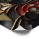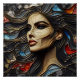 Um retrato de uma bela mulher exuberando arrogância no estilo abstrato. A técnica de vidro manchado emprega linhas de ouro artístico, combinando cores vermelhas, azuis e carvão. Seu cabelo cascata como ondas no oceano, acrescentando um toque de elegância vibrante a esta cativante representação de confiança.