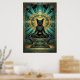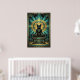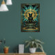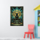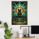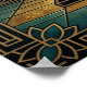 This majestic art deco black cat sits enthroned on a stepped pyramid pedestal beneath a golden sun disc and teal geometric jewelry motifs. The symmetrical composition and rich 1920s palette evoke ancient luxury perfect for exotic interiors, offices and cat lovers seeking sophisticated, culturally inspired wall decor with timeless appeal.