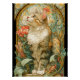 Um gato majestoso com pele exuberante e detalhada se senta graciosamente entre um arranjo ornamentado de flores e videiras giratórias, todas enquadradas em um intrincado design ao estilo Art Nouveau. O gato olha para cima com sabedoria serena, banhado em luz de ouro suave, enquanto o fundo floresce com tons ricos de pastel e terra, criando um sentido de beleza eterno e elegância natural.