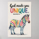 Uma ilustração em aquarela de uma zebra com listras coloridas. A zebra está em pé sobre um fundo simples. Acima da zebra, está o texto "Deus Fez Você Única.".