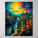 À medida que o sol se põe, o céu se torna uma canvas para uma impressionante exibição de luzes e estrelas mágicas, lançando um brilho quente sobre a vila. Esta poster de arte é uma celebração da imaginação, onde a fantasia encontra a realidade, e cada canto está cheio de promessa de aventura.