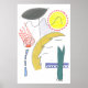 O trabalho de arte é uma composição de abstrato com várias formas geométricas e orgânicas. Na parte superior, um círculo semelhante ao sol é realçado com um contorno vermelho saliente e preenchido com amarelo. Uma linha preta forte de curva liga vários elementos, incluindo uma forma verde tipo folha no topo esquerdo. Abaixo dele, as linhas curtas vermelhas irradiam de um círculo menor parcialmente traçado em laranja. Uma forma grande de crescente amarelo domina o centro, intersetado por linhas horizontais negras e desiguais. À direita, uma forma verde vertical com pequenos pontos pretos contrasta com um bar azul horizontal marcado com pontos redondos e uma fina linha preta por baixo. A peça exibe um uso lúdico de cores e linhas, criando uma composição dinâmica e viva.
