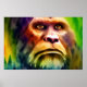 Arte de retrato de cor d'água extremamente próxima de Bigfoot aka Sasquatch olhando à distância com um brilho amarelo e verde, e uma sugestão de árvores florestais/a natureza selvagem.