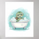 Adicione charme ao seu espaço com esta adorável arte de parede infantil de banheiro com tartaruga na banheira em estilo aquarela azul turquesa e aqua suave.