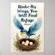 Um ninho de pássaro em aquarela com ovos, cercado pelas palavras "Sob As Suas Asas, Você Encontrará Refúgio"