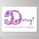 Lindo pôster com monograma da letra D, perfeito para o quarto ou sala de brincar de meninas em tons de azul-marinho, branco, rosa e roxo. Personalize com o nome curto da sua filha que comece com D e o significado do nome para um toque verdadeiramente personalizado no quarto ou berçário da sua filha, este exemplo é para o nome Darcy Uma conquistadora chique, rica, corajosa e destemida. Impressão de pôster fofa ideal para presente de novo bebê, batizado ou chá de bebê. © Desenho exclusivo de corações e flores com monograma da letra D e design gráfico por Sarah Trett. www.sarahtrett.com para www.mylittleeden.com