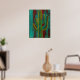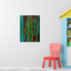 Combinação design original de fundo abstrato em turquesa e vermelho com cacto pintado manualmente em amarelos reflexivos brilhantes, verdes, vermelhos, azuis e laranja se combinam para uma arte alegre e colorida em parede.