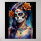 Entra num mundo onde a tradição encontra a beleza moderna. Esta imagem captura uma mulher adornada com maquiagem de açúcar, seu rosto uma canvas de cores vibrantes e motivos florais. A maquiagem, simbólica de Día de los Muertos, não é apenas uma homenagem aos que partiram, mas uma celebração da própria vida. Com rosas de laranja anjadas em seu cabelo escuro e joias turquesas acentuando suas feições, ela encarna o espírito alegre deste festival cultural.