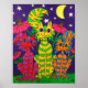 Decorem suas paredes em estilo com este poster único e colorido de arte popular. Neste alvoroço, trabalho de arte capricho, estes três felinos de cor brilhante estão sentados na grama diante de um pedaço de flores rosadas exóticas sob uma lua crescente e um céu noturno cheio de estrelas roxas.