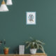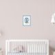Arte para berçário com ilustração de uma coruja azul com barriga em chevron empoleirada em um galho com folhas verdes e marrons. A borda é azul. Personalize o nome.