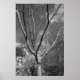 Uma atraente foto branca e negra de uma árvore com suas ramificações levantadas ao sol da tarde como se a estivesse adorando.