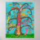 A Árvore da Vida, uma árvore com muitos ramos, é um tema recorrente arquetípico em muitas culturas mundiais, sinalizando a interconectividade de toda a vida em nosso planeta. Ela aparece na trabalho de arte, teologia, filosofia e mitologia em todo o mundo. Esta versão colorida apresenta folhas coloridas, padrões brancos de latido e inúmeros gatos multicoloridos em ação, cada um coberto com marcas coloridas únicas que lembram as encontradas em talhas pintadas de animais de Oaxacan.