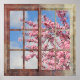 Cena da janela com Cherry Blossom Tree de flores rosa bonito e céus azuis com nuvens fofinhas tiradas em primavera com falso quadro de janela para adicionar a sensação de trazer o dentro para o exterior.