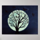 Um gráfico temático assustador de halloween. Uma grande lua de cheio brilhando intensamente por trás de uma velha árvore cagada de morto com corvos sentados em seus galhos. Muitos pássaros voando ao redor do céu profundo e azul.