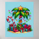 Poster com uma imagem de feriado sazonal. Uma palmeira tropical decorada em luzes festivas com uma estrela no topo. Uma bengala branca e vermelha gigante que sai da areia. Presentes de Natal debaixo da árvore. Whimsical e divertido.