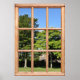 Sunshine em Árvores e uma Cena de Stone House Esta janela falsa irá dar-lhe uma melhor vista da sua casa ou escritório. A cena relaxante através da falsa armação de madeira mostra um par de árvores maduras com suas folhas verdes de verão, em um largo gramado. Além disso há uma cobertura escura e a parede de pedra de uma cabana escondida. O sol brilha e o céu é azul nesta impressão fotográfica.