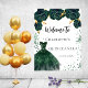Poster de boas-vindas para uma Quinceañera, festa de aniversário 15. Um fundo branco decorado com flores verdes, rosas e confete. Personalize e adicione um nome e data.