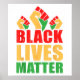 Black Lives Matter Poster A imagem contém três punhos levantados em cores vermelha, amarela e verde no topo. Abaixo dos punhos, o texto "BLACK LIVES MATTER" é escrito a negrito, em letras angustiadas. A palavra "BLACK" está em vermelho, "LIVES" está em amarelo, e "MATTER" está em verde. Esta imagem é uma poderosa representação do movimento Black Lives Matter, que defende os direitos e a igualdade das pessoas Negras e aborda questões de racismo sistêmico e violência.