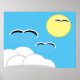 Três gaivotas voam num céu azul brilhante. Os cantos inferiores à esquerda são nuvens brancas e onduladas, com sombras de cinza. Gaivota menor/mais distante em frente à órbita amarela do sol.