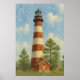 This watercolor image depicts the iconic Assateague Lighthouse in Virginia with a soft, watercolor design. The dominant feature is the lighthouse itself, rendered in crisp whites and reds, giving it a bright, clean appearance. Its tall, tapered form rises majestically, topped with a dark, contrasting lantern room that adds a focal point.