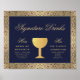 Uma assinatura elegante Bebe sinal de casamento, recomendada para um casamento com cores de marinho e ouro. O fundo é marinho azul. Tem bordas de ouro floral com intrincadas decorações de rosas selvagens. Todo texto é ouro. O título Signature Drinks e as legendas "Hers" e "Sua" são escritas em uma escrita caligráfica elegante, o resto em bonés. No centro, entre Hers e Suas coquetéis, há uma taça de vinho de folha de ouro falsa. As decorações de rosas de ouro são de um cobrir de livros antigos, de 1912, de As Obras Políticas Completas de Geoffrey Chaucer, agora no dominio público.