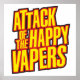 A frase "Ataque dos Vapers Felizes" em um logotipo amarelo e vermelho em negrito, baseado em uma poster de filme de terror retrovisor. Humor viciante para todos os usuários felizes do ecig.