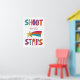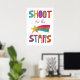 Estilos de estilo pintados divertidos indicam a mensagem SHOT FOR THE STARS em caracteres azuis, amarelos, lavandas, laranja e cor-de-rosa contra um fundo branco comum junto com um gráfico de estrela cadente correspondente.