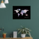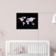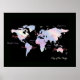 Um mapa do mundo gráfico e aquoso em cores cor-de-rosa macio, com o nome de continentes e oceanos, sobre fundo negro
