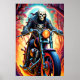 um esqueleto preso na bicicleta do pandemônio. Andando pelo trilho de fogo entre os ramos interligados. Ele tem uma bicicleta pulada. Ele tem uma calça preta de couro e botas de motocicleta E uma jaqueta de couro preto com design de borda de osso como design na roupa de bicicleta. Com a lua chegando atrás dele. Haze ascensão do fogo ao seu redor... na noite escura... ele se afasta com estrelas noturnas acima.