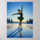 Uma elegante pintura a óleo de Deco de Arte de um skater de gelo em uma fantasia esmeralda surpreendente, sua forma geométrica elegante iluminada pela luz da orla do ouro de amanhecer enquanto ela gira sobre um lago congelado e polido.
