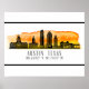 design de ímã de carro na moda oval apresenta silhueta de linha do horizonte da cidade de Austin Texas com abertura de cor d'água e coordenadas de mapa de latitude e longitude