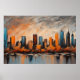 Este poster apresenta uma pintura em abstrato-acrílico que captura lindamente uma paisagem urbana no pôr do sol. A paisagem urbana é composta por prédios ousados, em forma geométrica, que ficam altos no cenário de um céu dramático. Os prédios, em tons de azul, cinza e preto, acrescentam um sentido de profundidade e dimensão à cena. A margem d'água, pontilhada com árvores, adiciona um toque da natureza à paisagem urbana. As árvores, mostradas em uma vibrante sombra de laranja, apontam na estação do outono. Os prédios e árvores lançam suas reflexões sobre a água, criando um efeito espelho que melhora o apelo visual geral da pintura. O céu é um espetáculo em si mesmo, com uma mistura dramática de cinzas, laranja, branca e azul. As cores do céu parecem mudar com o sol de pôr, acrescentando um sentido de dinamismo à cena. O tema da cor geral do horizonte complementa as cores do céu e da margem d'água, criando uma experiência visual harmoniosa. Este poster de arte moderna, com a sua representação abstrato de uma cidade ao pôr do sol, certamente atrai os espectadores com as suas cores ousadas, imagens dramáticas e talento artístico. É um testemunho da beleza que pode ser encontrada nas paisagens urbanas e nas estações em mudança. Seja você um entusiasta da arte ou simplesmente alguém que aprecie belas cenas, este poster é certo de fazer um excelente adicional em sua casa.