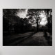 Uma fotografia branca e preta, quente, tirada entre as árvores de Bute Park Cardiff, numa tarde ensolarada de novembro, o sol de outono no céu brilha através das árvores, lançando sombras longas e silhuetas dramáticas.
