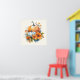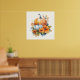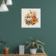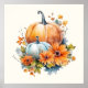 Poster com uma imagem do tema de queda. Abóboras laranja e branca cercadas por folhas do outono e flores laranja.
