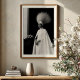 Chame a atenção para esta impressionante impressão de arte branca e negra, uma verdadeira obra-prima da moda de vanguarda e expressão artística. Este retrato impressionante apresenta uma mulher de majestosa poesia, coroada com um extraordinário e volumoso chapéu branco que irradia para cima com pontas agudas e intrincadas, adornada com delicados embelezamentos. Vestida com um vestido branco pristine, de colar alto e uma capa arrebatadora, seu traje minimalista oferece uma sofisticada canvas para o chapéu dramático. Seu tom de pele escura contrasta lindamente com o puro vestuário branco, criando uma poderosa declaração visual. Criado em alto contraste monocromático contra um fundo dividido cativante de cinzas pretas e macias profundas, este trabalho de arte enfatiza a forma, a textura e a presença poderosa do sujeito. Perfeito para espaços modernos, estúdios de moda, ou qualquer decoração que busque um toque de elegância única, artista ousada, e uma narrativa visual verdadeiramente inesquecível.