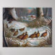 Uma pintura antiga da década de 1800 com uma ilustração colorida e deliciosa de aves em um cenário de inverno.
