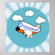 Avião de animação adorável voando pelos céus e nuvens azuis. Sobre um fundo de explosão solar em azul